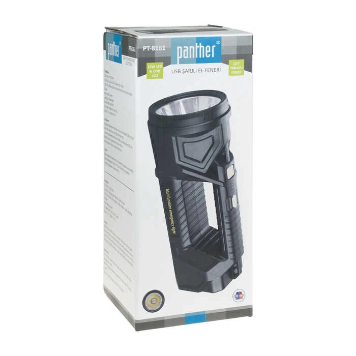 Panther PT-8161 Şarjlı El Feneri, güçlü 15W LED ve çok işlevli COB LED teknolojisiyle donatılmış, maksimum 1500 lümen parlaklık sunan üstün performanslı bir el feneridir. Dayanıklı gövdesi ve ergonomik tasarımıyla hem evde hem de dış mekanlarda güvenle kullanılabilir.