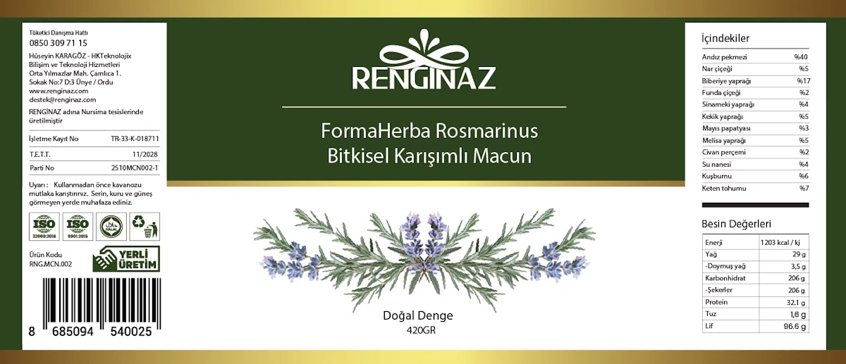 Renginaz FormaHerba Rosmarinus Bitkisel Karışımlı Macun, özenle seçilmiş bitkisel bileşenlerin geleneksel yöntemlerle harmanlanmasıyla hazırlanmış özel bir formüldür. Günlük yaşam temposunda ihtiyaç duyulan doğal desteği sunmayı amaçlayan bu macun; yoğun bitkisel içeriği, aromatik tadı ve dengeli yapısıyla hem lezzet hem de destek arayan kullanıcılar için ideal bir seçenektir.