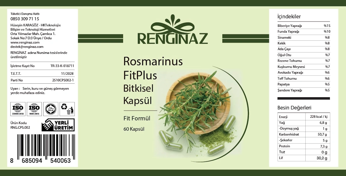 Renginaz Rosmarinus FitPlus, hijyenik ve modern üretim tesislerinde hazırlanmış olup, kullanımı kolay 60 kapsüllük ambalajı ile uzun süreli kullanım imkânı sunar. Kimyasal katkı maddesi içermez ve tamamen doğal içeriğiyle öne çıkar.